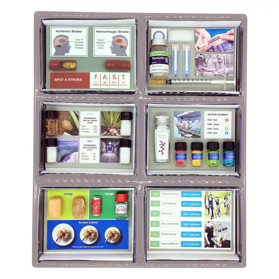 A 3D presenter of general health and wellbeing presenting the subject in a unique and stimulating way. The durable and light-weight carry case securely stores two trays in which there are 12 crystal cases containing the individual items. Subjects covered include;