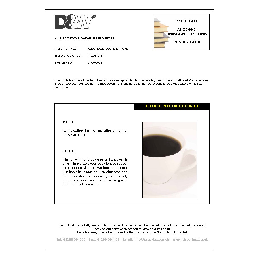 The details given on the V.I.S. Alcohol Misconceptions Sheets have been sourced from reliable government research, and are free to existing registered D&Wp customers.