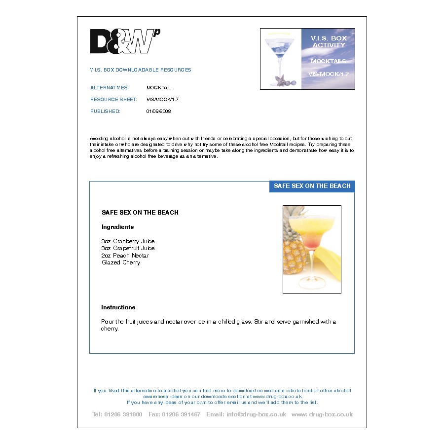 Print multiple copies of this set of 11 non alcoholic 'Mocktail' recipes to use as group hand-outs.