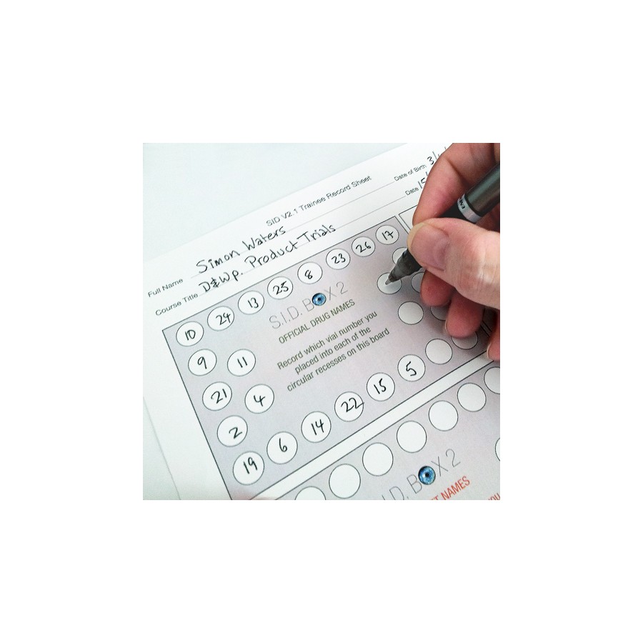 The D&Wp S.I.D. Box 2 is designed to test the participants knowledge both pre and post drug awareness training, it may also be used as a fun learning game at any time. 26 S.I.D. bottles containing a small sample of a replica drug or associated substance. Each S.I.D. bottle is securely sealed and labelled with a number. Participants must identify the contents and place each bottle in its corresponding 'slot' on the S.I.D. Board.